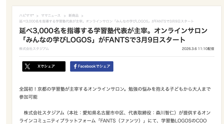 このたび、このオンラインサロンのプレスリリースが29社(3/7現在)のメディアにて